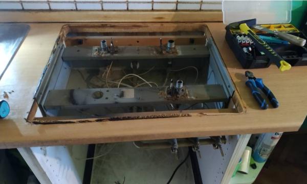 Po demontaži stare pečice in kuhališča je bilo potrebno povečati izrez pulta in odstraniti prečko elementa, katera je ovirala ploščo pri vstavitvi. Nekatere plošče imajo globino 50 mm in temu primeren mora biti tudi prostor, kamor se vgradi kuhalna plošča. Prav zaradi tega smo morali spustiti tudi nosilce pečice, ker je plošča nasedla na pečico. Ko smo preverili razmak med pečico in kuhalno ploščo smo oboje priklopili na električno omrežje, preverili še delovanje pečice in plošče, ter zaključili z montažo. Stranka je želela tudi odvoz starih aparatov, katere smo odpeljali v reciklažo. Čas menjave ca. 1.5 ure.