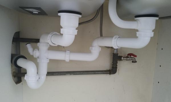 Odstranili smo staro korito s sifonom in zaprli oba glavna ventila za toplo in hladno vodo, da smo lahko opravili menjavo ventilov. Ko sta bila ventila zamenjana, smo odprli glavna ventila, ter preverili ali v času preostale montaže kje zamakata. Novo korito je bilo dimenzijsko malo širše in globje od prvotnega iz umetne mase. Povečali smo izrez v pultu, da je novo korito lepo sedlo. Korito smo s spodnje strani pritrdili v pult. Ker je korito reverzibilno smo morali narediti tudi luknjo za kuhinjsko armaturo. Montirali smo armaturo, jo priklopili na nove ventile in začeli z montažo dvojnega sifona. Sifon je bil tokrat priložen koritu, zato z njegovo montažo nismo imeli težav. Ko je bilo vse skupaj sestavljeno smo preizkusili tesnenje sifona, ventilov in cevi kuhinjske pipe. Gospa nas je še prosila ali ji zamenjamo star, že malo počrnel silikon, ki je skrbel za tesnenje med pultom in steno. Z veseljem smo ji utregli in ji ga zamenjali. Čas montaže ca. 4 ure.