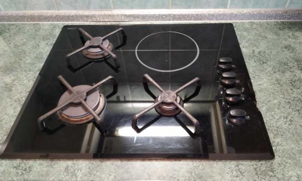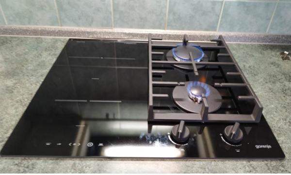 Pri gospe Olgi smo menjali star kuhinjski set Gorenje za novega s kombinirano kuhalno ploščo indukcija-plin. Razlog za menjavo je bila počena kuhalna plošča in pokvarjeni tečaji pečice. Začeli smo z odstranitvijo kuhalne plošče. Zaprli smo dovod plina, odklopili električni vodnik, ki je bil vezan direktno na priključnico in odklopili cev za plin. Odstranili smo staro kombinirano kuhalno ploščo Gorenje in vstavili novo, ter jo priklopili na plin in elektriko. Preverili smo tesnenje plinske cevi, ter preverili ozemljitev. Ker je imela plošča že vgrajene šobe za zameljski plin ni bilo potrebe po menjavi. Na koncu smo preverili pravilno delovanje indukcijskih kuhališč in plinskih gorilnikov.