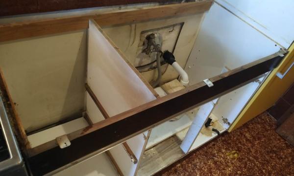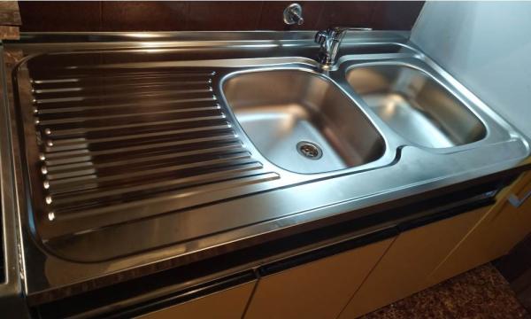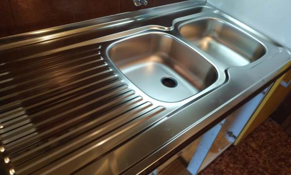 - Opis reference Gospe Katji smo zamenjali dvojno pomivalno korito, vključno z montažo in priklopom kuhinjske pipe in sifonom. Kadar gre za star tip kujhinjskega elementa s koritom, ki je ločen od ostalih elementov in nima pulta, je potrebno veliko pazljivosti pri sami demontaži starega korita. Odstranili smo sifon, zaprli vodo in sneli korito z elementa. Po odstranitvi so se pokazale vse skrite napake, ki jih je z leti uporabe povzročilo zacejanje vode. Pred namestitvijo novega korita smo odstranili ves preperel les in ga nadomestili z novim. Nadaljevali smo s prilagajanjem novega korita na element in ko je bil le-ta poravnan oz. zniveliran, smo ga uspešno pritrdili na element. Ker gre za reverzibilno korito, pomeni, da nima narejene luknje za kuhinjsko armaturo. Z namenskim orodjem smo izsekali luknjo in namestili pipo, ki smo jo priklopili na vodovod. Potrebno je bilo namestiti še dvojni sifon. Glede na to, da niti zgornji, niti spodnji sifon ni bil priložen h koritu, smo uporabili univerzalni dvojni sifon, s katerim smo imeli precej dela, da smo ga uspešno prilagodili koritu. Preverili smo še tesnenja in zaključili z montažo. Čas montaže ca. 3 ure.