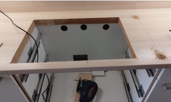 - Opis reference Stranki smo montirali in priklopili dve novi kuhalni plošči Bosch. Stranka je imela željo poleg klasične indukcijske plošče imeti še dodatno plinsko kuhalno ploščo. Ker je prostor omogačal vradnjo še ene kuhalne plošče smo povečali že obstoječi izrez v pultu in namestili poleg indukcijske plošče še enojno plinsko. Plošči sta na stiku podprti z nosilcem, kateri omogoča stabilnost prav tako pa tesnenje med ploščama.