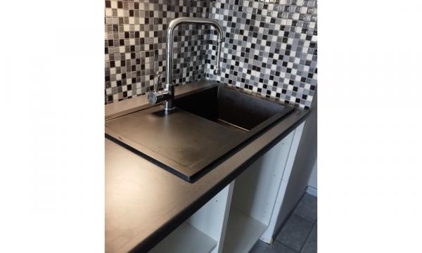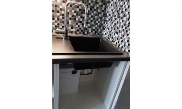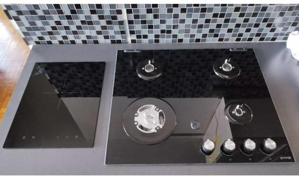 - Opis reference Stranki smo postavili spodnji del kuhinje vključno z montažo dveh kuhalnih plošč, pomivalnega korita iz umetne mase in armature. Po postavitvi in niveliranju elementov smo naredili izreze v delovno ploščo za pomivalno korito in dve kuhalni plošči. V pult smo namestili korito in ga pritdili na kuhinjske elemente. Namestili smo kuhinjsko armaturo, zmontirali sifon in priklopili pretočni grelnik vode. Ker ima stranka glavno kuhalno ploščo na plin smo dodali še manjšo indukcijsko ploščo. Tako lahko ob izpadu plina ali elektrike še vedno uporablja eno izmed kuhalnih plošč. Plinsko kuhalno ploščo smo priklopili na plin vključno z novo cevjo. V zgornji kuhinjski element pa smo vgradili vgradno izvlečno napo.