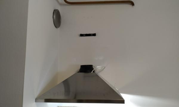 Ker je imela gospa prazno steno nad štedilnikom, sama montaža ni bila zahtevna. Edini problem je bila vtičnica, ki je bila prav na mestu, kamor naj bi bila montirana napa. Vtičnico smo odstranili in napo namestili tako, da smo lahko naredili zunanji električni priklop, ki je skrit v samem dimniku nape. Tako smo težavo rešili tako s praktičnega, kot tudi estetskega vidika. Po priklopu nape na električno omrežje, smo namestili še dimnik, kateri je na vrhu zaprt, tako da prečiščen potuje nazaj v prostor skozi rešetke na levi in desni stran dimnika. Po končani montaži smo napo preizkusili, pospravili za sabo in zaključili z montažo. Čas montaže ca. 1.5 ure.