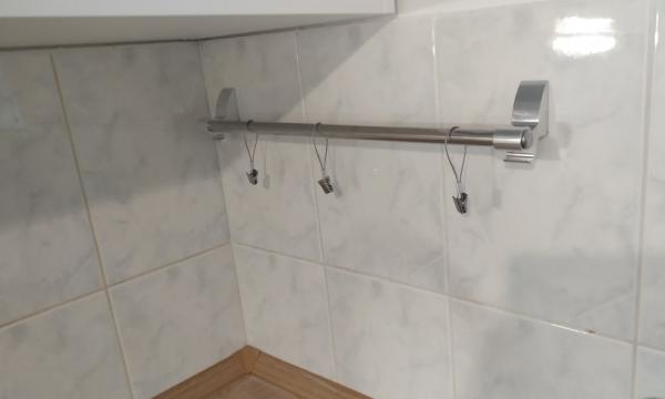 Gospa Teja nas je prosila, če ji lahko napeljemo odvod kondezacijske vode centralne plinske peči, ki se nahaja v sosednjem prostoru v kuhinjo in od tam v kuhinjski sifon. Iskali smo najboljšo in najlažjo rešitev s čim manj posega v samo kuhinjo. Cev smo napeljali vertikalno po steni do tal in nato pod kuhinjskimi elementi, do kuhinjskega sifona. Ker je imel sifon prvotno narejen priključek samo za pomivalni stroj, smo namestili del s še enim kolenom in na tega priključili cev za odvod kondenzacijske vode. Odvod vode deluje preko nameščene vodne pumpe, ki nato vodo požene do odtoka v kuhinji. Cev smo na kolenu sifona dodatno zatesnili še s silikonom, da ne bi prišlo do neželjenega puščanja vode. Gospa nas je še prosila, če ji lahko v kuhinji in kopalnici pritrdimo obešala za kuhinjske pripomočke in brisače. Z veseljem smo ji ustregli in s tem tudi zaključili z montažo. Čas montaže ca. 3 ure.