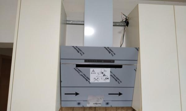 - Opis reference Gospodu Matjažu smo menjali že pomivalni stroj in takrat smo se dogovorili tudi za montažo nove nape. V kuhinji nimajo odvoda zraka iz prostora, pred nakupom nove nape, pa so imeli vgradno izvlečno napo. Ker bi bilo za montažo nove vgradne nape potrebno predelati celoten kuhinjski element, smo se po posvetovanju z gospodom Matjažem odločili za odstranitev celotnega kuhinjskega elementa in za montažo stenske nape. Odstraniti smo morali napo, nato pa še sam element, katerega se ni dalo odstraniti skupaj z napo. Po odstranitvi elementa, smo preverili električno napeljavo in na željo stranke, smo namesto direktne vezave priključili električni razdelilnik z vtičnicami in ga montirali na vrh kuhinjskih elementov, tako, da je napa sedaj priključena preko vtičnega kabla na električni razdelilnik, ki bo služil še za priklop led lučk pod elementi. Na steno smo namestili stensko poševno napo Samsung, ki deluje preko dveh oglenih filtrov, tako, da smo rešili tudi problem z odvodom zraka. Glede na samo višino elementov in tudi zaradi izgleda smo namestili samo spodnji del dimnika. Vse skupaj smo priklopili, preizkusili napo in zaključili z montažo. Čas montaže 3 ure.